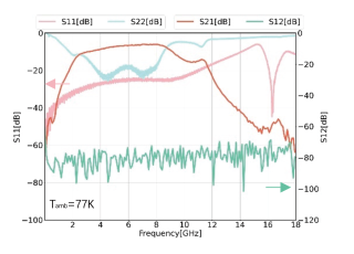 SMA読み出しラインのテスト曲線を右に示します(CuNiケーブル、NbTiケーブル、メッキ銅ケーブル、アダプターを含む)