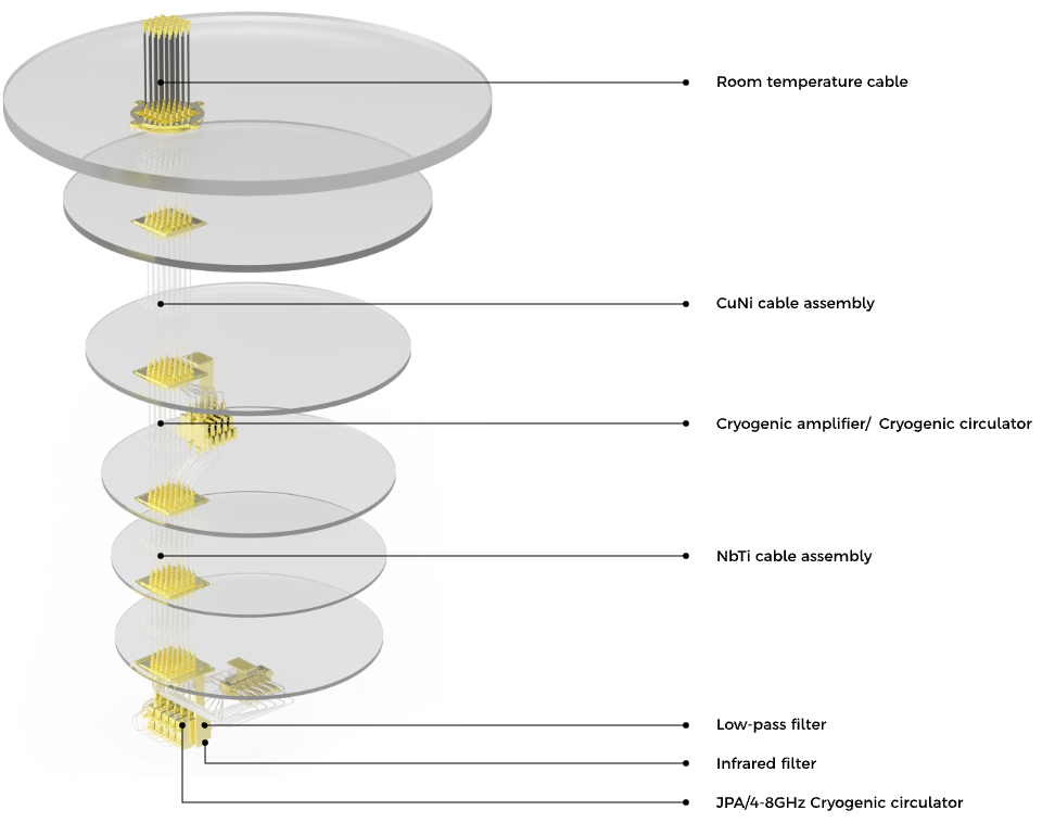 サーキュレータとカスタマイズ可能な赤外線フィルタを併用したリードアウトラインは、4Kレベルの極低温超電導ケーブルおよび低雑音増幅器に接続されます。ライン全体で極めて低い減衰と最小限の発熱を実現。HQubitはSMAおよびSSMPコネクタを提供します。