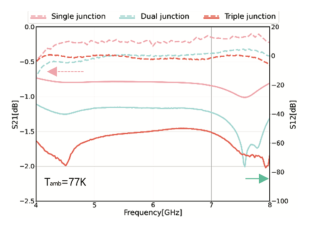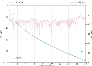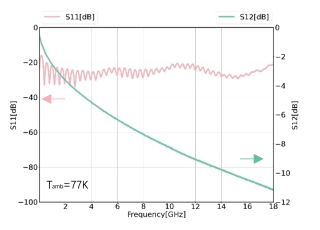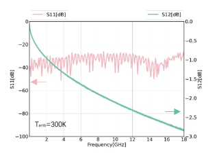 SMA読み出しラインのテスト曲線を右に示します(CuNiケーブル、NbTiケーブル、メッキ銅ケーブル、アダプターを含む)